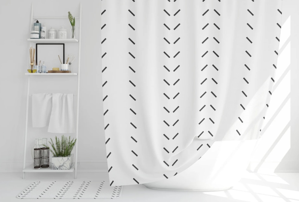 Choose water-resistant fabric and a heavy hem to keep it straight. Match a simple rug and towels for a balanced modern look. Very modern.