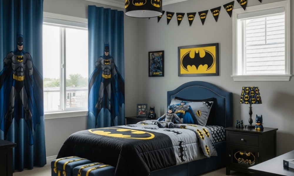 Hang curtains with your kid’s favorite cartoon characters or themes. Easy way to completely change how the room looks.