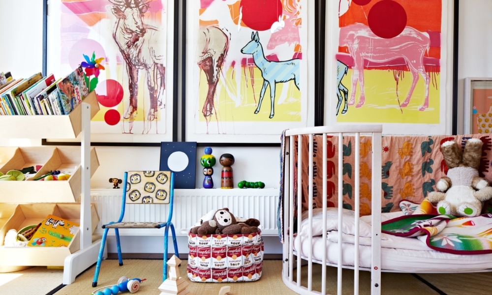 Put your kid’s artwork on the walls. Mix it with some colorful prints you bought. Change them out when you get new ones.