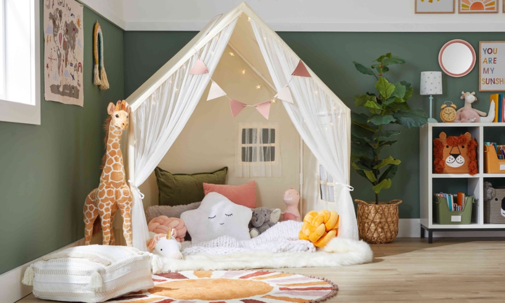 Create secret hideouts with hanging fabric or small tents. Kids love having their own private space inside their playroom.