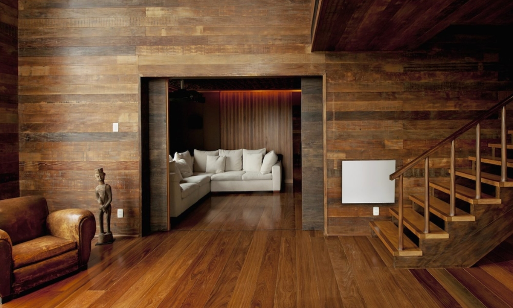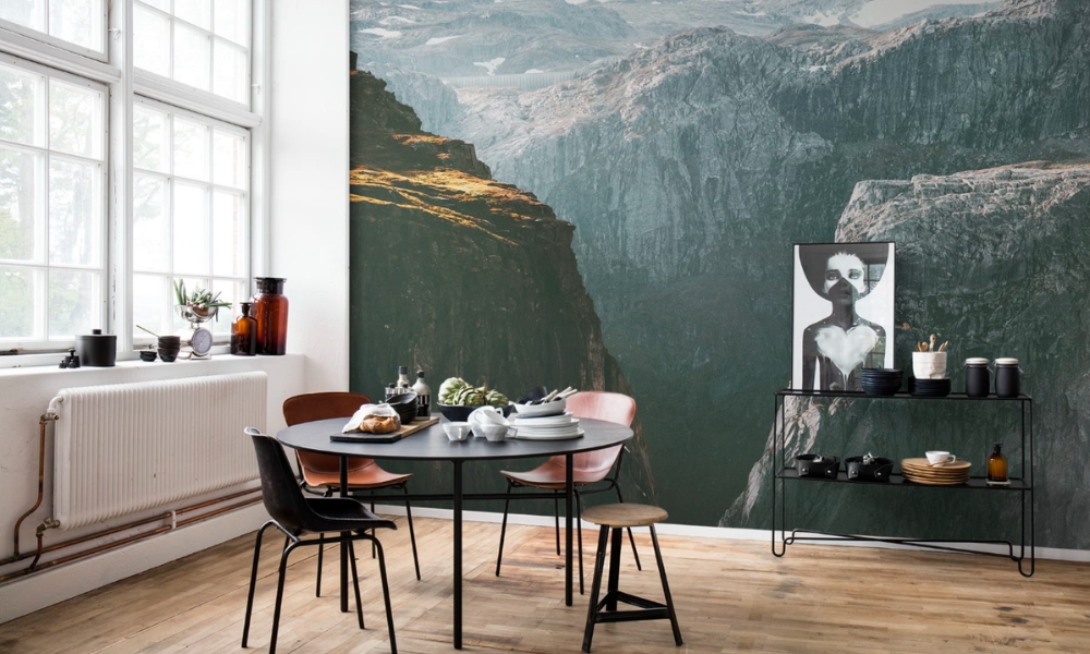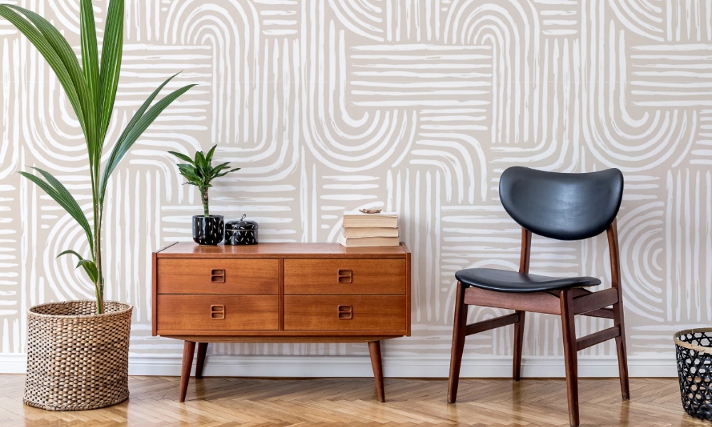 Natural wood warms any wallpaper. Oak, walnut or teak adds organic contrast to printed walls. Wood shelves, frames, coffee tables or exposed beams can be used to connect the paper to the room. In case of cool-toned wallpapers, light wood should be used to maintain the equilibrium.