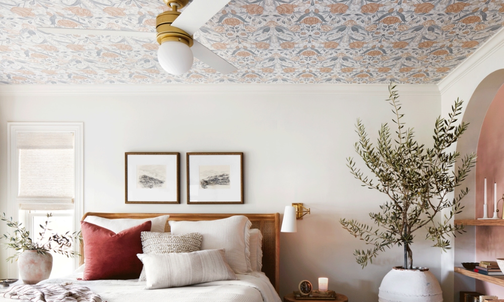 A wallpapered ceiling pairs well with plain walls. Use this trick in cozy rooms or dining areas for a boutique hotel feel that feels intentional and special.