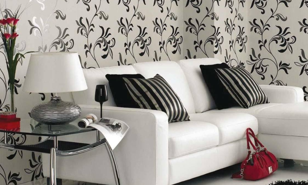 Black and white patterns work for both modern and classic looks. This option is a great path to classy wallpaper designs for living room without using color.